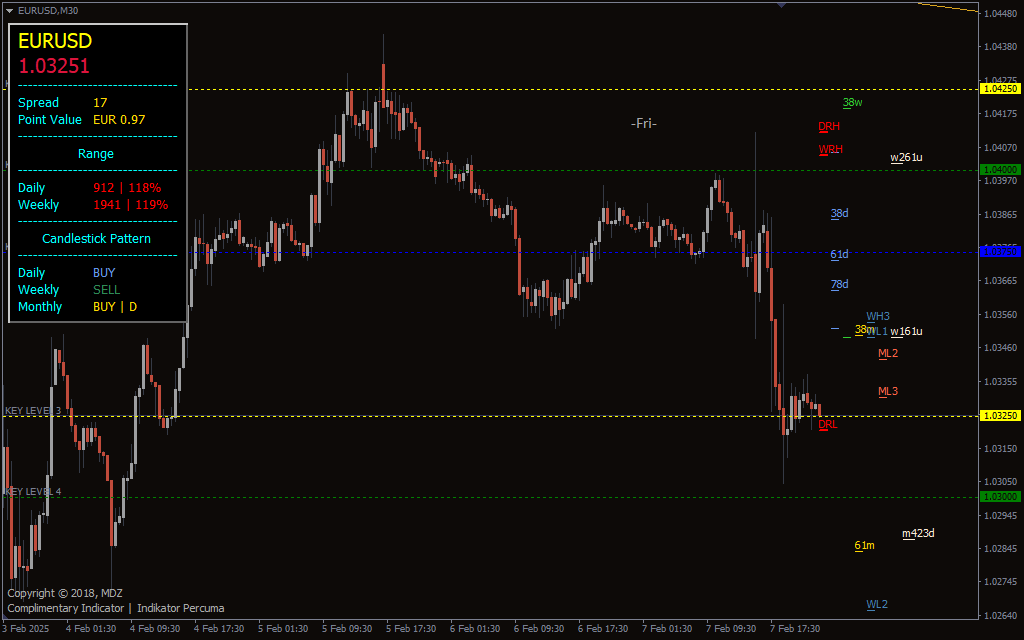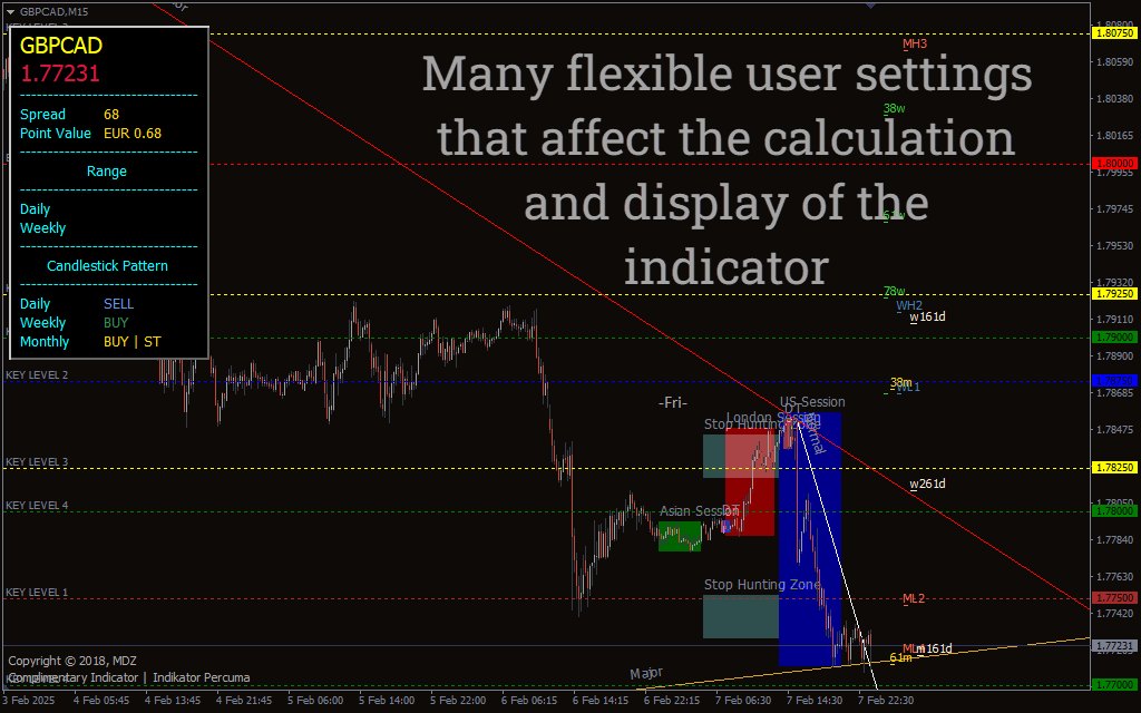 The MDZ Price Action Indicator is a comprehensive trading tool for MT4 that combines multiple price action elements to provide traders with clear insights into market behavior. It displays key support and resistance levels, daily and weekly ranges, and candlestick patterns, making it an ideal choice for traders who rely on technical analysis. Whether you’re looking for high-probability trade setups or want to confirm existing strategies, this indicator provides valuable market insights in an easy-to-use format.