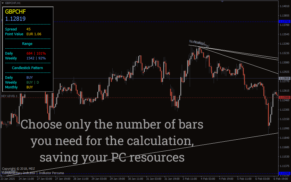 This indicator helps traders by marking critical price zones and trends. It highlights key levels that can act as support and resistance, providing insights into potential reversal or breakout areas. The inclusion of daily and weekly ranges assists in measuring volatility, while candlestick pattern detection allows traders to spot high-probability trade setups. Fibonacci retracement levels offer further validation for potential price movements. The indicator also provides alerts on crucial market conditions, helping traders execute well-timed entries and exits.