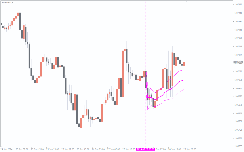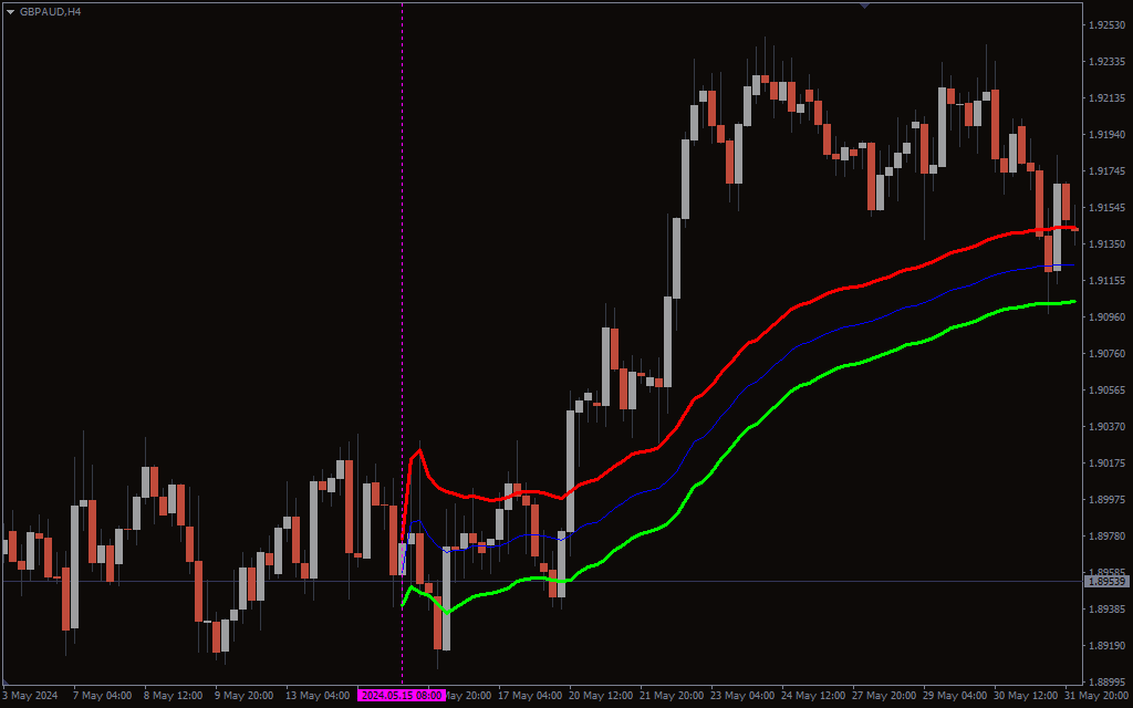 The indicator plots a magenta VWAP line and the support and resistance lines. Additionally, it plots a vertical dotted carrier line. Traders can drag the carrier line on the price chart to indicate the beginning of the channel. This enables traders to effectively look at a short or long-term support and resistance according to their trading style.