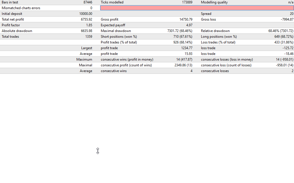 The system shows consistent growth after backtesting, but it often displays significant drawdowns during unfavorable market phases. Maximum drawdown is relatively high, indicating that risk management is a vital component in making the most of this EA.