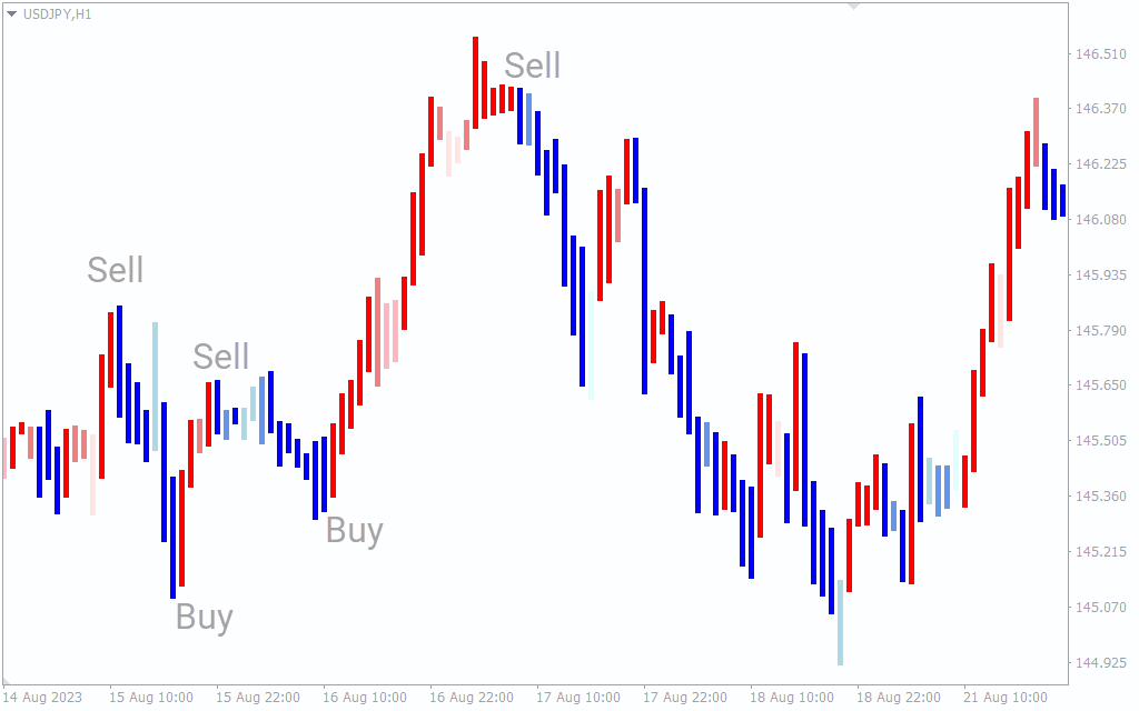 The trading strategy is based on the color change of the candles from blue to red and vice versa. A red bullish candle signals the forex trader to open a buy trade with a stop loss below the previous swing low. Similarly, traders should initiate a sell position once a red candle appears.