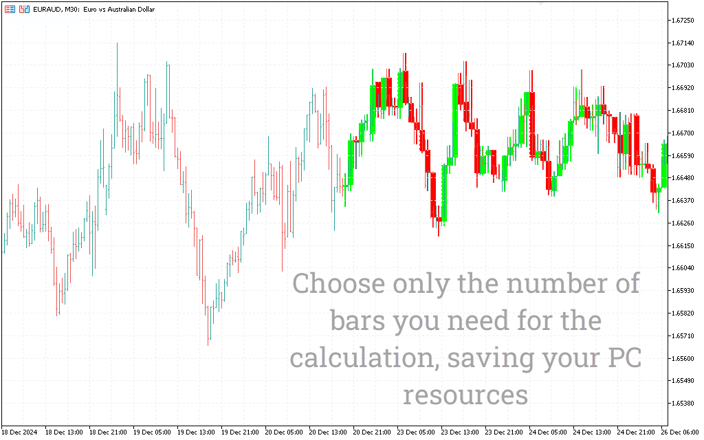 The MTF Candle Indicator generates insights by displaying the candles of higher timeframes on the active chart. This visual representation helps traders to identify potential market turning points and continuation patterns more effectively. For instance, a bullish higher-timeframe candle appearing during a pullback in a downtrend might indicate a potential reversal or market pause. Similarly, the appearance of strong bearish higher-timeframe candles in an uptrend suggests possible exhaustion.