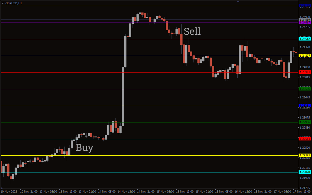 When the price remains above the central pivot point, it signifies a bullish market condition, while a bearish scenario unfolds when the price falls below this point. Traders buy when the price reaches the lower-level aqua line. Place your stop loss slightly below the previous low. Place your take profit based on your risk-to-reward ratio.