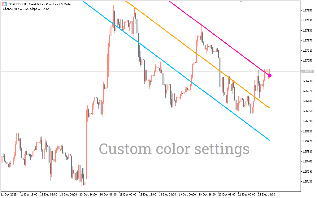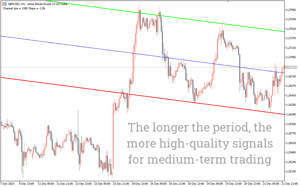 The NB Chi Channel True indicator for MT5 draws three lines on the chart. You can use these lines to determine trend direction and likely support and resistance levels.