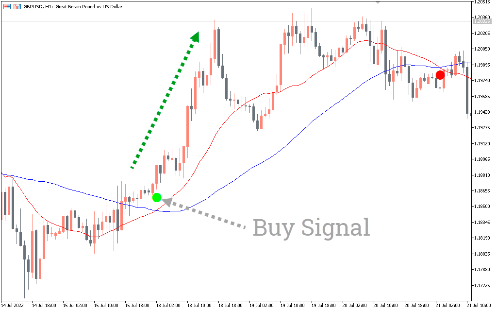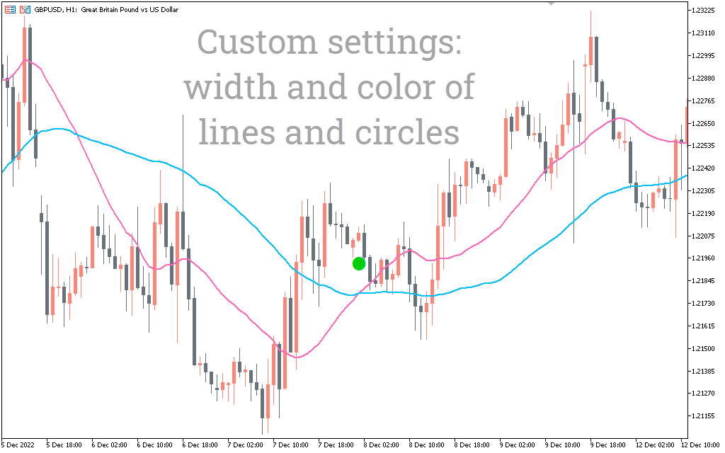 For long positions, you should make sure that the red line is above the green line and is pointing up. In addition, the indicator will draw green circles when it is sure of a buy signal. When the red line crosses the green, it indicates a trend reversal.
