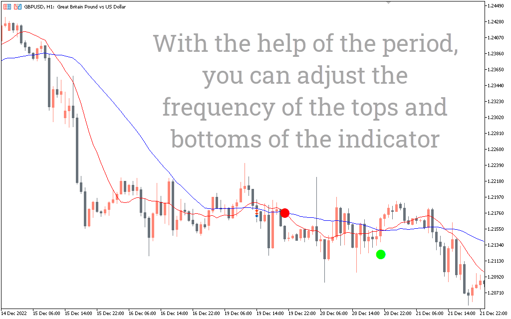 The indicator gives a sell signal when the red line should fall below the green one and draws a red circle. When the red line crosses the green line, it means the trend is changing.