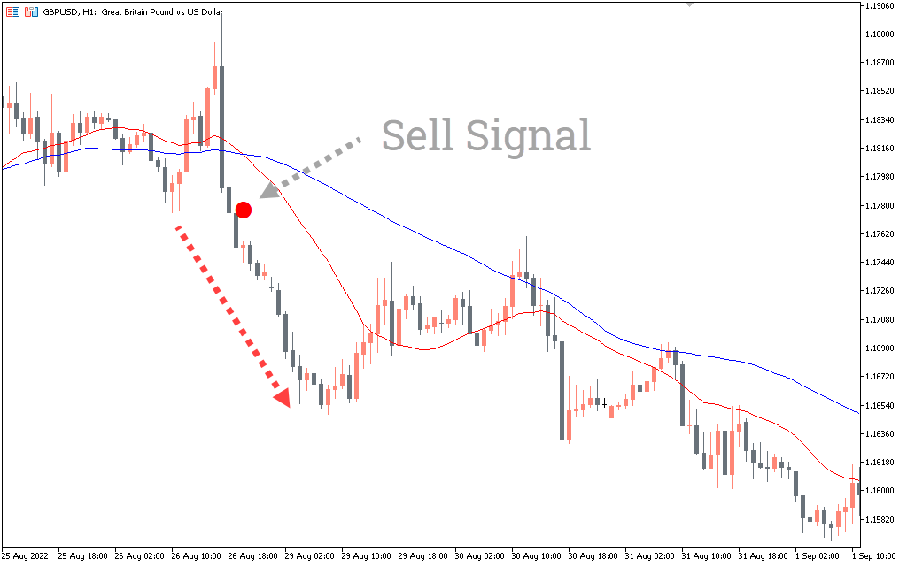 This picture shows the British pound against the US dollar. A suitable sell signal appears when the red line crosses the green line below and a red circle appears. The indicator line is also moving down, which means that the market is in a downtrend.