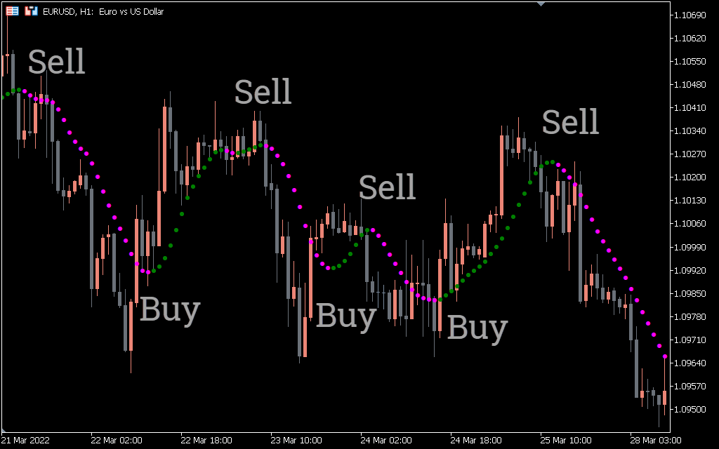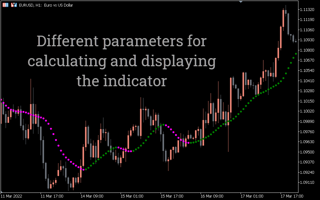 The above EURUSD H1 price chart shows the Non Lag Dot Indicator For MT5 in action. The indicator shows the BULLISH dots in GREEN and the BEARISH dots in PURPLE. The interpretation of the trading signals is pretty simple. The presence of GREEN dots on the price charts indicates a BULLISH market trend. While the presence of PURPLE dots indicates a BEARISH price trend.