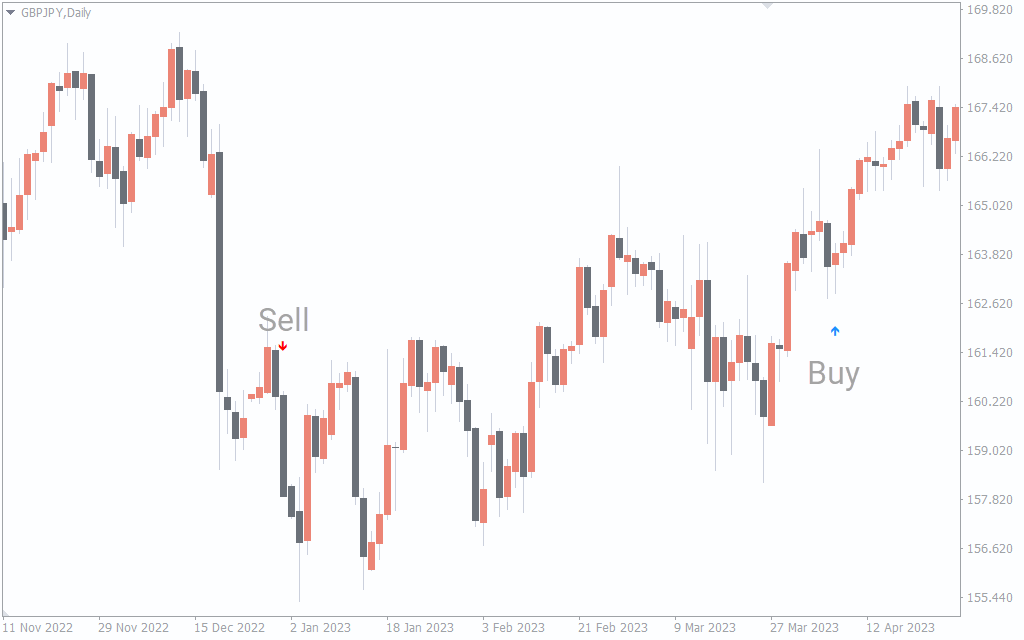If the faster moving average crosses the slower one upwards it plots and up arrow. Traders should enter the market with a buy trade anticipating the prices to move higher. Traders should place a stop loss below the previous swing low or exit at the opposite trading signal. Similarly, if a red arrow appears in bearish trend traders should enter a sell position.