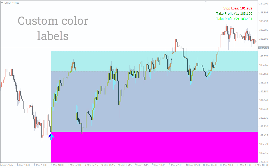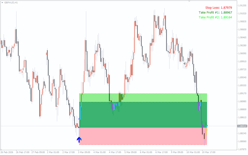 Something that is key from this indicator is how it organizes the trade. Rather than forcing traders to compute the risk separately, it calculates Stop Loss level and 2 Take Profit objectives automatically. The targets are derived by multiplying with Stop Loss distance and creating a built-in risk-to-reward model.