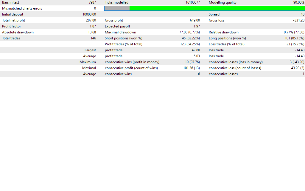 In testing, the EA showed steady account growth with minimal drawdown (below 1%), a good sign of stability. The profit factor for the same period is around 1.8 which also indicates consistent performance.