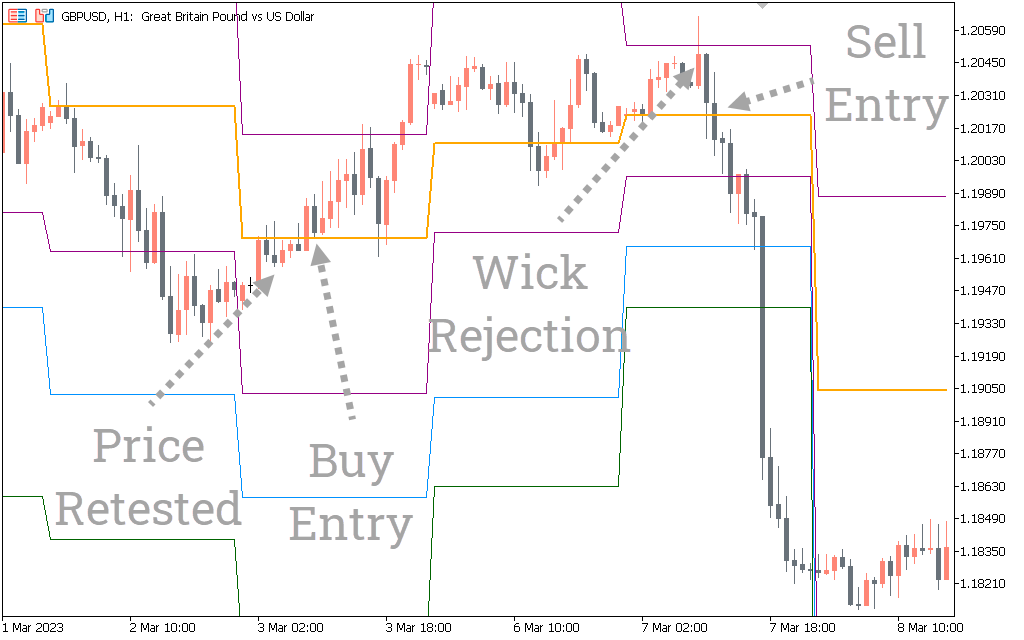 SELL Signal: First, wait for price to interact with the indicator’s resistance level and watch for visible wick rejection. With this condition, you can open a SELL/SHORT position in sync with the price action (eg bearish engulfing. Pin bars, etc.).