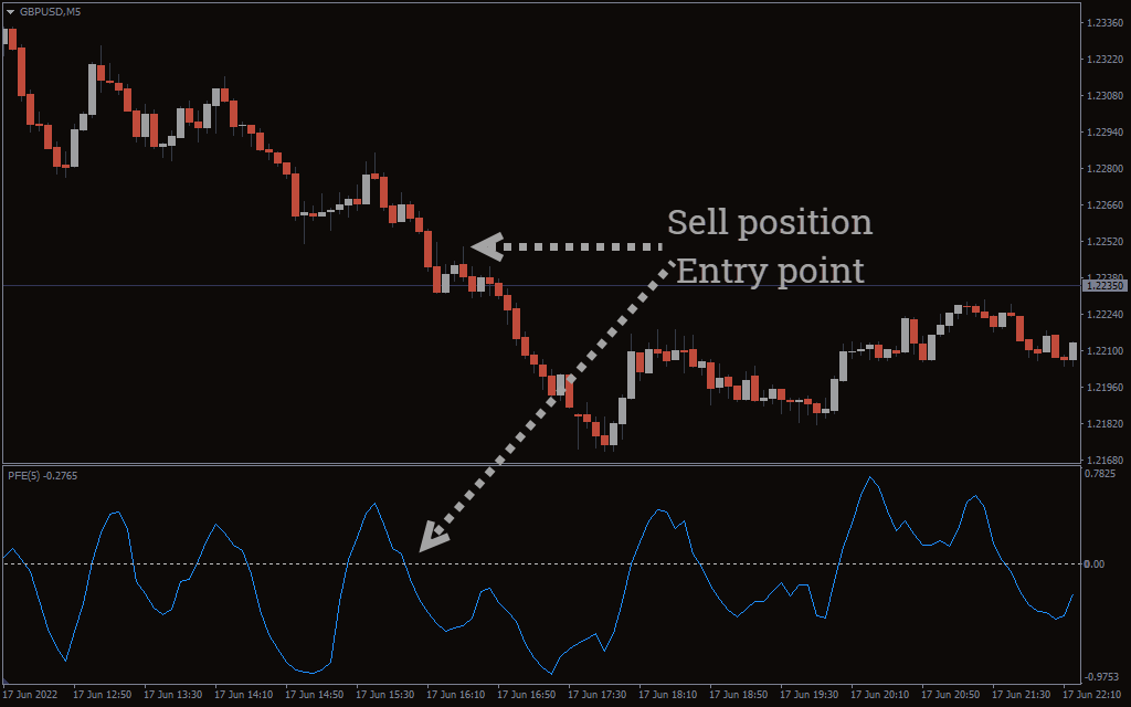 The picture shows the price movement of cable in a five minutes time frame. The indicator gives a sell signal when the value dips below the zero line. Notice how the price dipped as the indicator fell low into the negative zone. You should exit when the price crosses back to the positive zone.