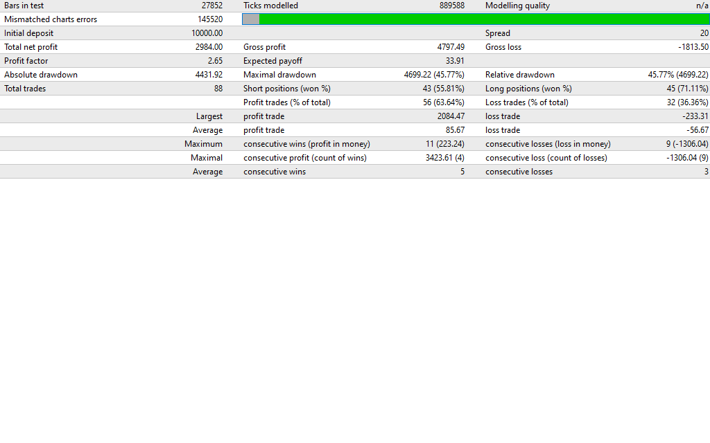 As per the backtest result, the EA performs with consistent results with approximately a $10,000 deposit that leads to a net profit of around $2,984 and with a profit factor of 2.65. Although quite few trades (88 total trades) is performed by the system, its more conservative and selective trading than any kind of aggressive scalping EAs.