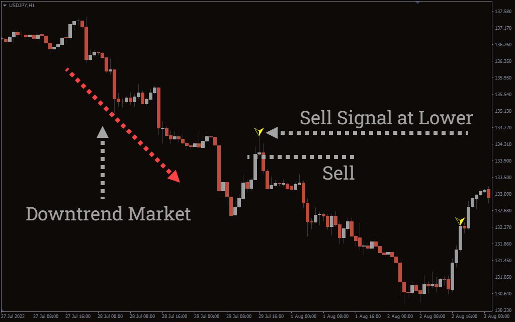 In the above USD/JPY hourly chart, the price was previously under a downtrend condition. Later, the price pulled back and created a lower high. At the same time, the Pulse Indicator plotted a bearish trend signal right above the solid bearish pin bar. We consider this setup a solid sell signal following the downtrend market.