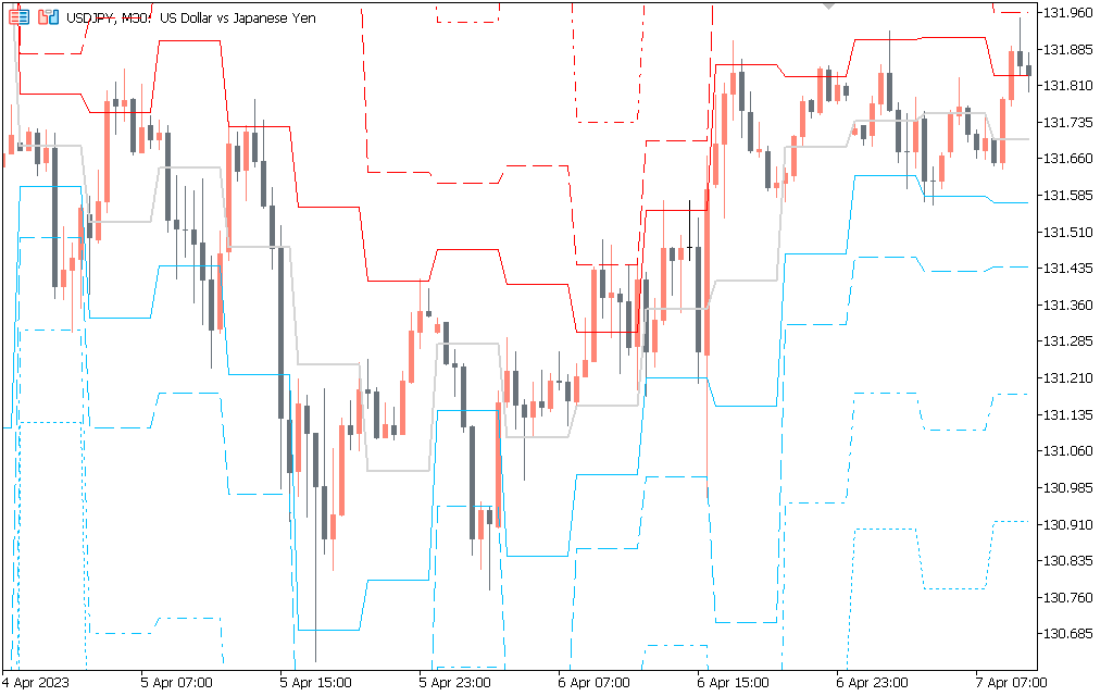 The indicator shows ideal areas of support and resistance. For example, you could enter a trade at 131.210 and place a take profit at 131.885, resistance levels at 132.100, and stop loss levels at 131.135 and 131.060.