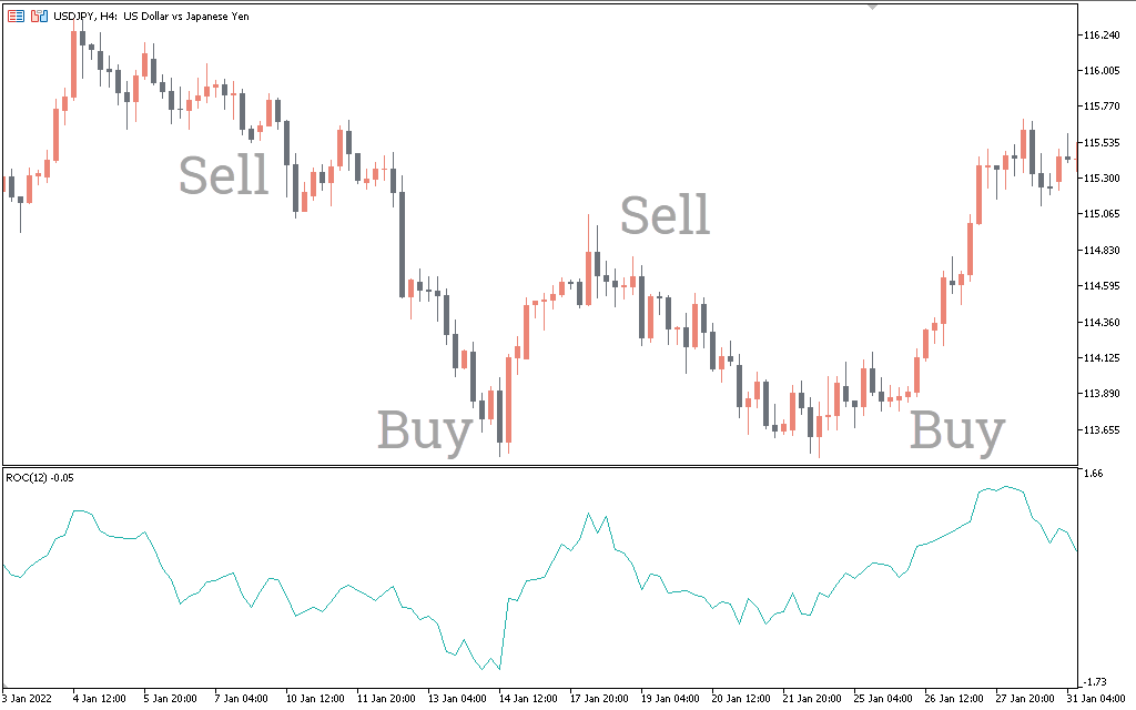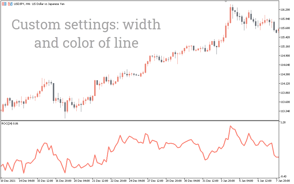 The USDJPY H4 chart above shows the ROC – Rate of change indicator for MT5 in action. The indicator displays values in Seagreen color in a separate indicator window as an oscillator with a zero line without an upper or lower limit.