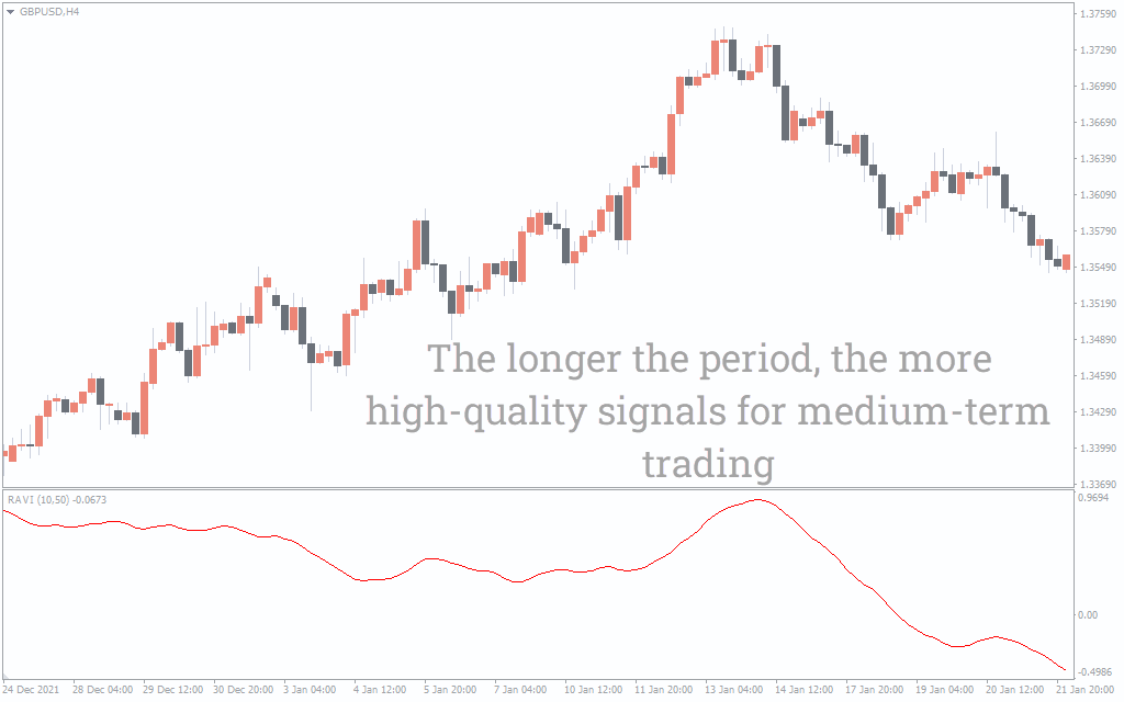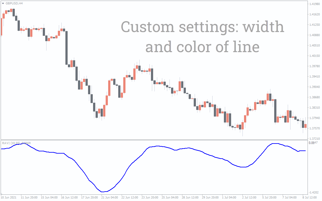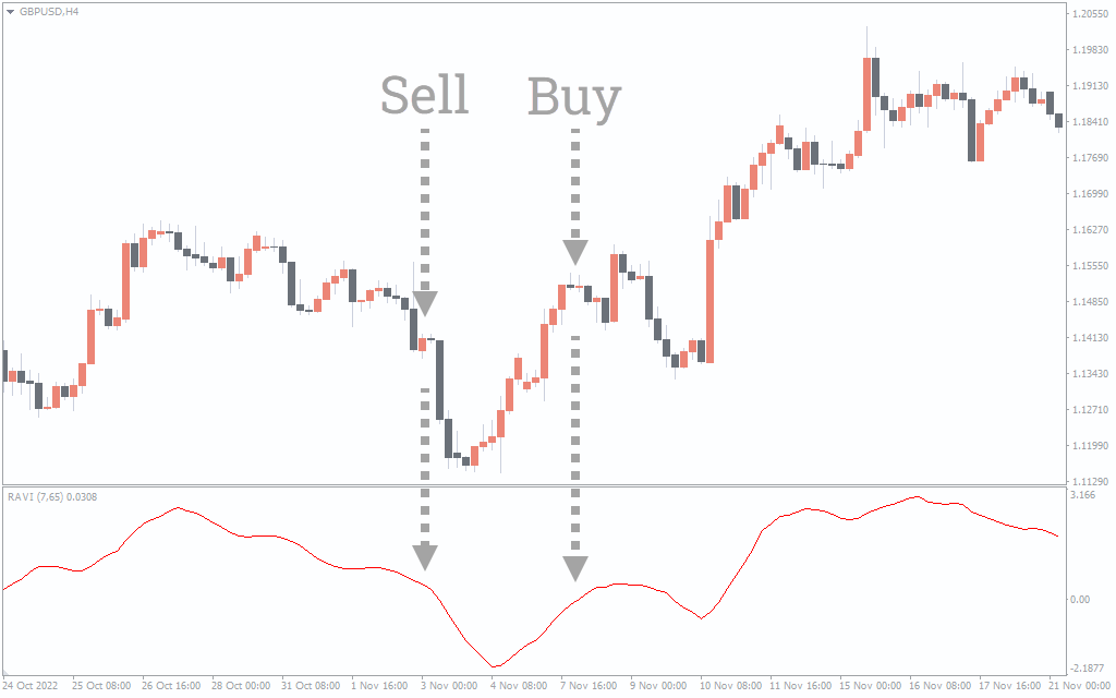 The above GBP/USD H4 chart shows the Ravi Indicator’s BUY/SELL signals. As mentioned earlier, the zero-line crossover is the most important aspect of the indicator. So, to determine BUY/SELL signals, you need to look for the zero-line crossovers. You can take a long position if the signal line goes above the zero line. Conversely, you can go short if the signal dips below the zero line.