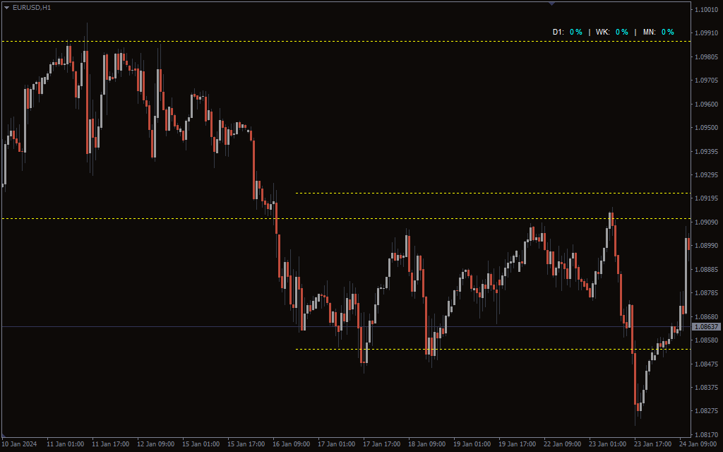 The Rectangle reader indicator for MT4 extends the trend lines of a manually plotted supply and demand zone continuously a few candles to the right. Furthermore, it displays them on lower time frame charts. So, forex traders can always be aware of higher time frame supply and demand zones and identify profitable trading opportunities in the lower time frame.