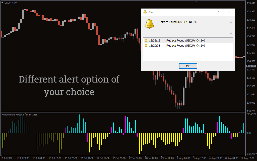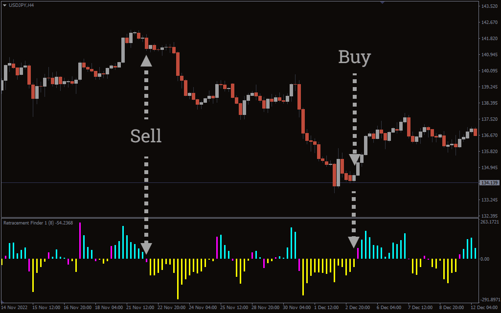 The above USD/JPY H4 chart shows the Retracement Finder Indicator’s BUY/SELL signals. You have to look at the bars to find the BUY/SELL signals. When the yellow bars appear, it means bulls are starting to lose strength, and we can anticipate a bearish reversal. On the other hand, if the aqua bars emerge, it suggests the weakening of a bearish trend and the start of a bullish trend.