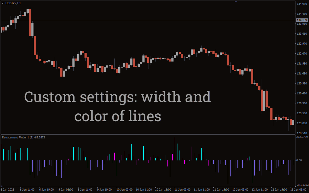 The aqua bars represent an uptrend, the yellow bars illustrate a downtrend, and the magenta bars mention a strong trend. It can either be an uptrend or a downtrend. The Retracement Finder Indicator works on every time timeframe, but it’s better to use it on a longer timeframe to avoid market noise and capture larger reversals rather than shorter ones.