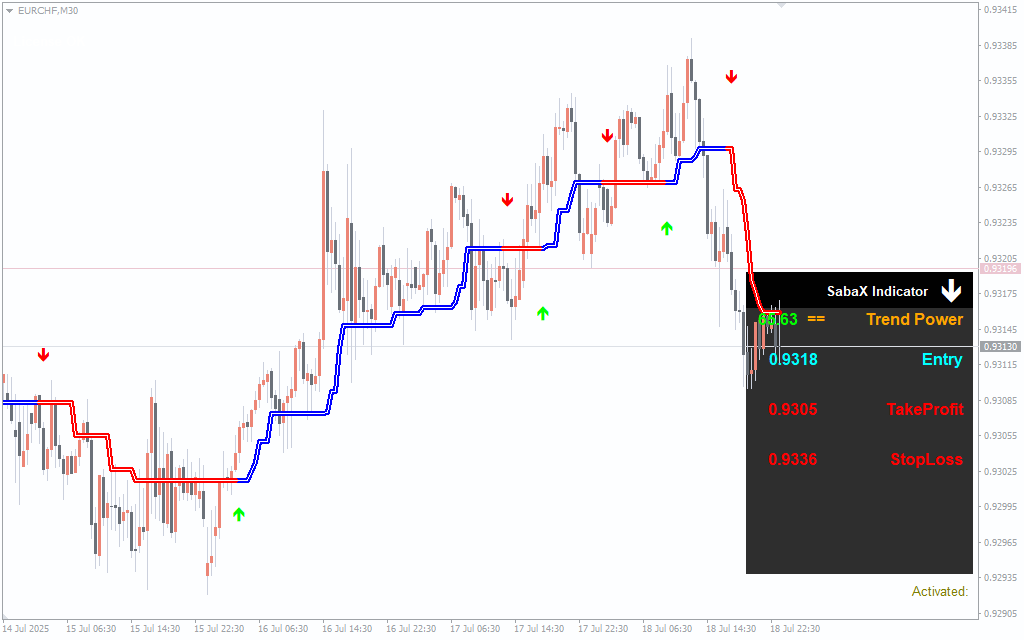 The indicator displays a colored line that switches between red and blue depending on the current trend: red for bearish and blue for bullish. Alongside this, arrows indicate suggested entries—green for buy opportunities and red for sells. On the right side of the screen, a dedicated information panel shows the exact entry price, recommended take profit, and stop loss values. This structured setup helps reduce second-guessing and supports disciplined trading. When the trend power changes, the display updates accordingly, giving a real-time view of market conditions.