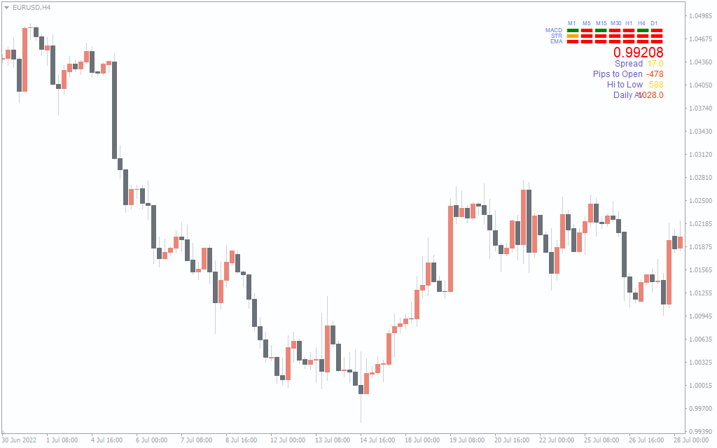 The Indicator combines all of the data from these indicators and shows spread accordingly. The indicator plots data from a 1-min timeframe to 1-Day. The green bars suggest an uptrend, while the red bars indicate a downtrend. Along with this info, the indicator shows the current market spread, pips to open, high to low, and daily average.