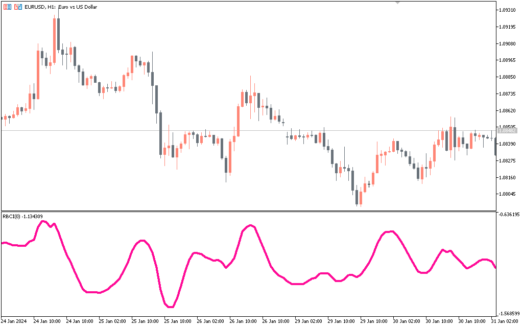 The RBCI indicator can be used to identify potential buy and sell signals when the histogram crosses above/below the zero line or when price forms a divergence from the histogram.