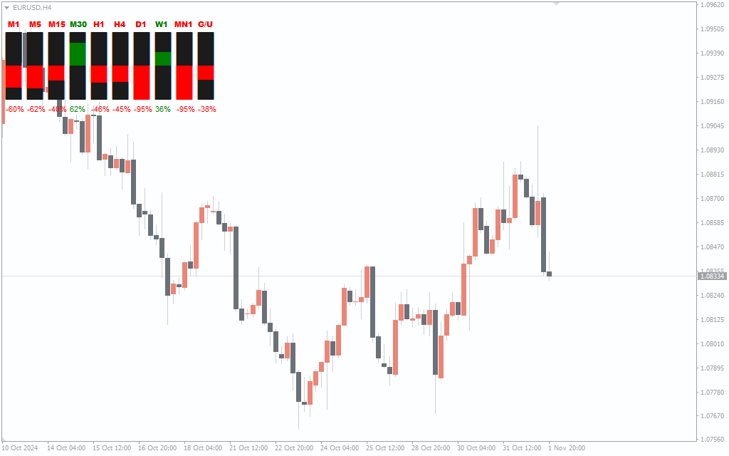 Traders can use this multi-timeframe overview to confirm trends and make more accurate trading decisions. For instance, if the majority of time frames are displaying green bars, it suggests a strong bullish trend across multiple levels, favoring buy positions. Conversely, if most time frames show red bars, it points to a bearish trend, making it more favorable for sell positions.