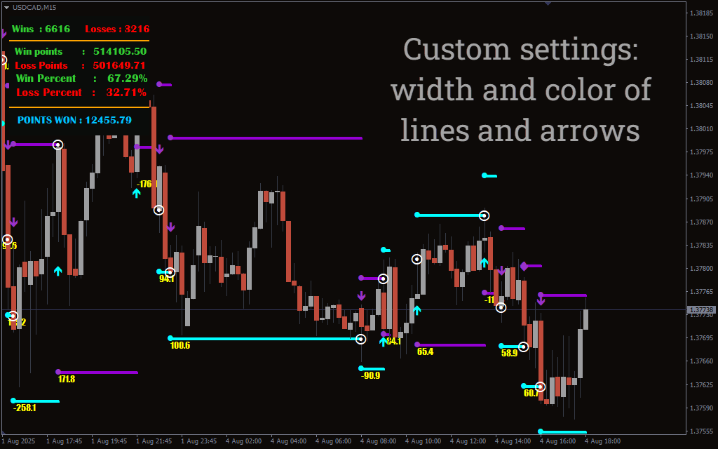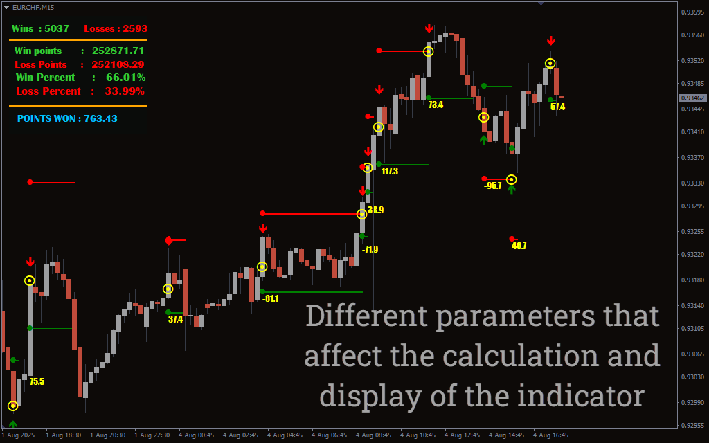 This indicator identifies optimal market entry points with green arrows for buys and red arrows for sells. It combines price action logic with trend and volatility filters, displaying entry signals directly on the chart. The arrows appear alongside take profit and stop loss levels calculated dynamically using the ATR multiplier, providing a clear risk-to-reward structure for each trade. Each signal is backed by a data panel showing total wins/losses, point performance, and win percentages. This gives traders real-time feedback and confidence to follow the strategy without hesitation or overthinking.