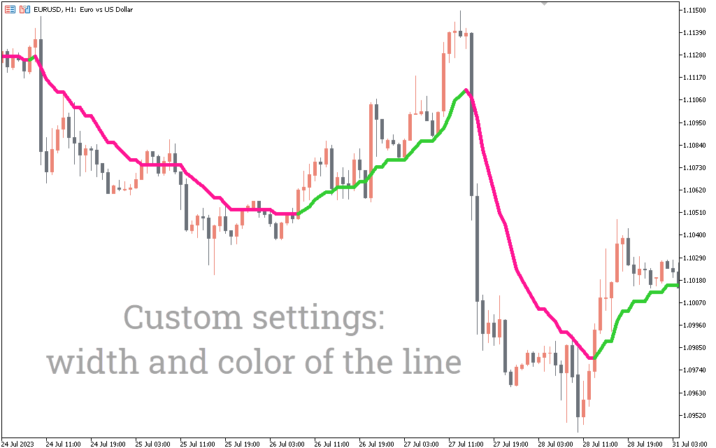 This approach eliminates latency and improves signal accuracy. Essentially, it functions similarly to a standard moving average with the addition of bands that indicate overbought and oversold conditions. When the price closes above the Step MA, it signals the start of a bullish market trend, while a close below indicates the start of a bearish market trend.