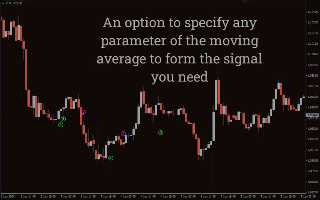 The buy and sell signals are displayed as numbers on the chart whenever the indicator line crosses the overbought or oversold limit. Buy signals are in numbers colored in lime, while sell signals are in magenta.
