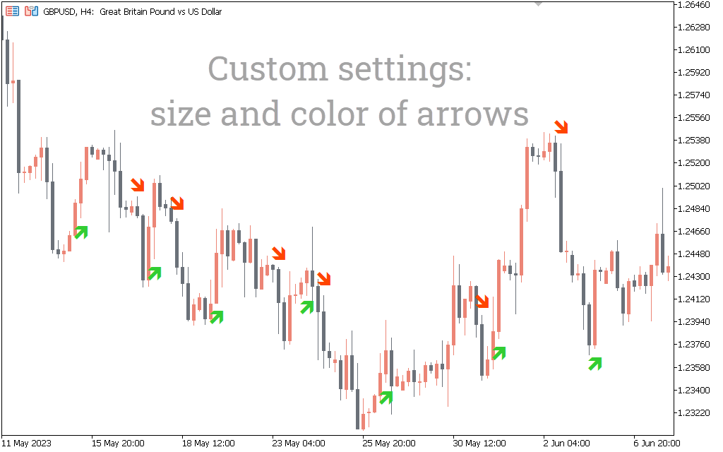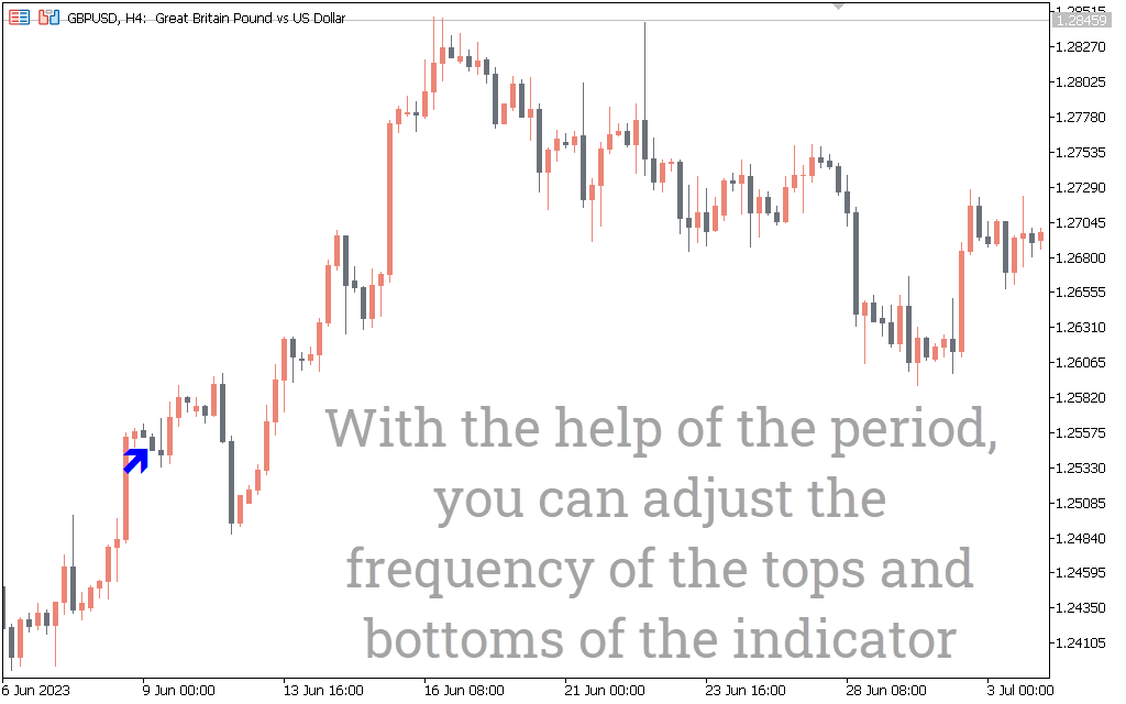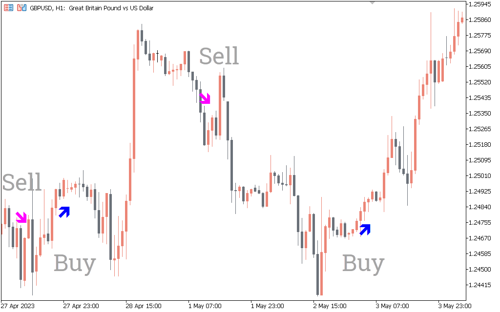 The GBPUSD price chart below shows the Stop versal indicator for MT5 in action. The indicator provides bullish trading arrows in blue and bearish arrows in forex trading signals in purple.