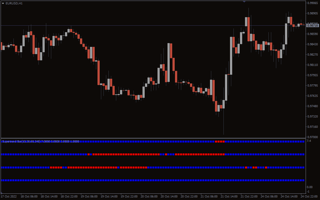 The Supertrend bar mtf Indicator for MT4 draws blue and red squares below the chart to present the overall trend’s direction. Traders can use the Supertrend bar mtf Indicator with other indicators for BUY and SELL signals. Also, you can download the indicator for free on our website.