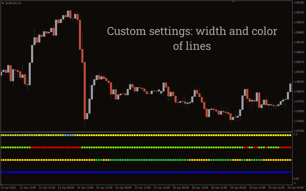 The above EUR/USD H1 chart shows the Indicator on the chart. The indicator doesn’t tell the BUY and SELL signals; it acts as a confirmation of the current market trend. Traders should use it as a secondary indicator rather than the primary one. Combining the Indicator with other indicators can help determine entry and exit points.