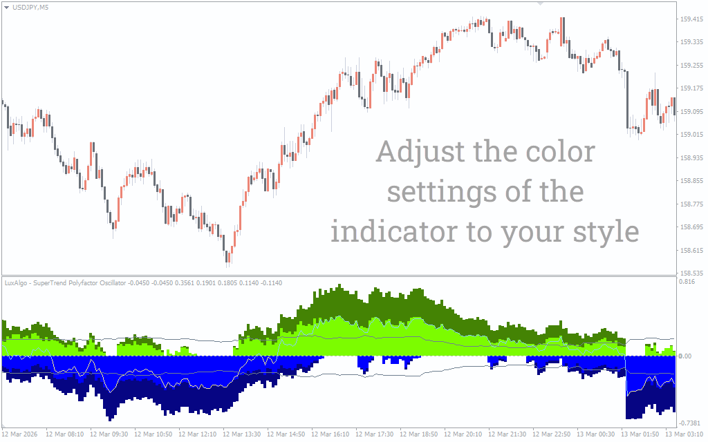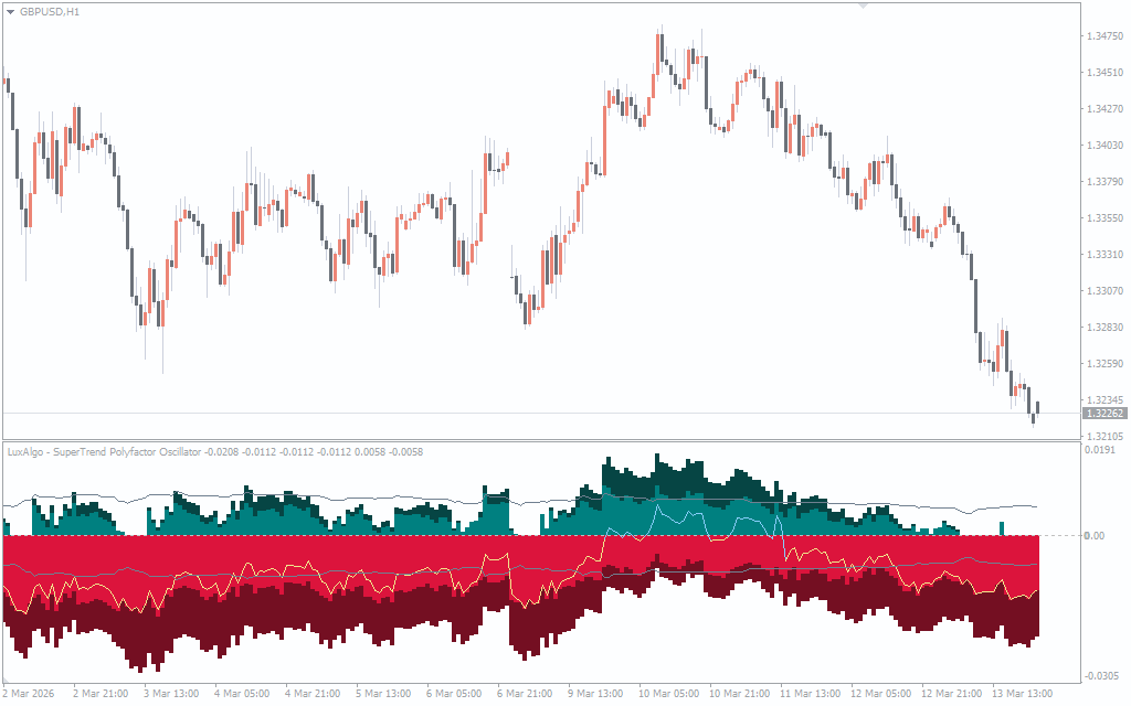 MT4SuperTrend Polyfactor Oscillator by LuxAlgo visualizes trend strength and momentum shifts using a dynamic SuperTrend-based oscillator.