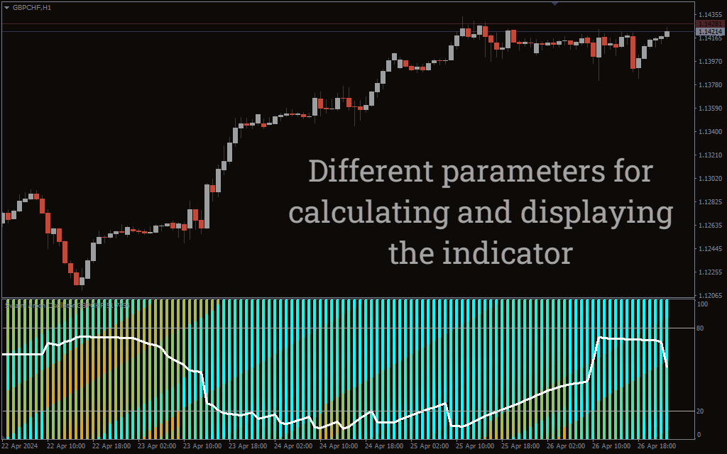For a sell position, look for the lime green bars, which indicate a bullish market. Wait for the indicator to get overbought above 80 to enter. Hold the position until the indicator gets oversold.