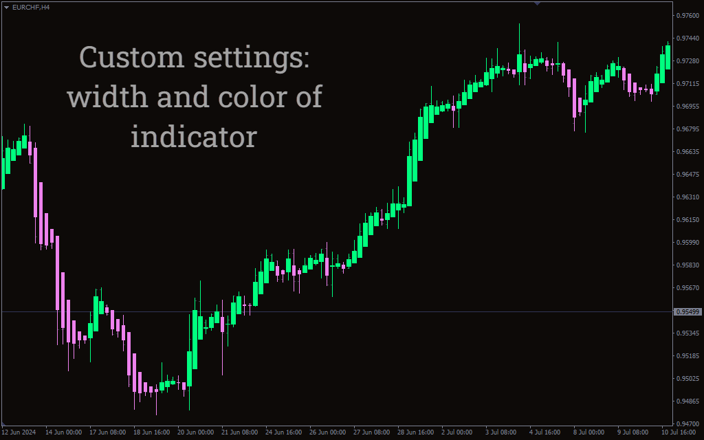 Traders can use these color changes as signals to enter or exit trades. For instance, when the bars turn Royal Blue, it may be a good opportunity to enter a buy position. Conversely, when the bars switch to Crimson, it could be a signal to sell or exit a long position. The indicator also allows traders to adjust the thickness and style of the bars to match their personal preferences or to emphasize specific market conditions.