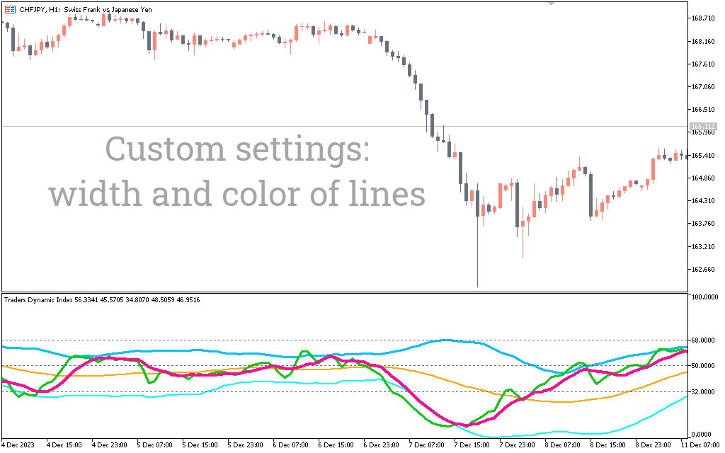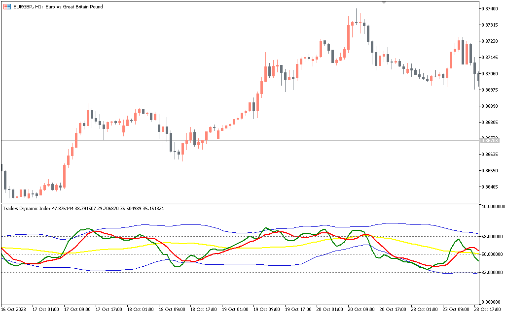 The most important line of the TDI indicator is the yellow line. The line connects all other components and makes the indicator suitable for trading. Long-term trends can be identified using the yellow line. When the line moves away from these boundaries, it indicates the possibility of a trend change.