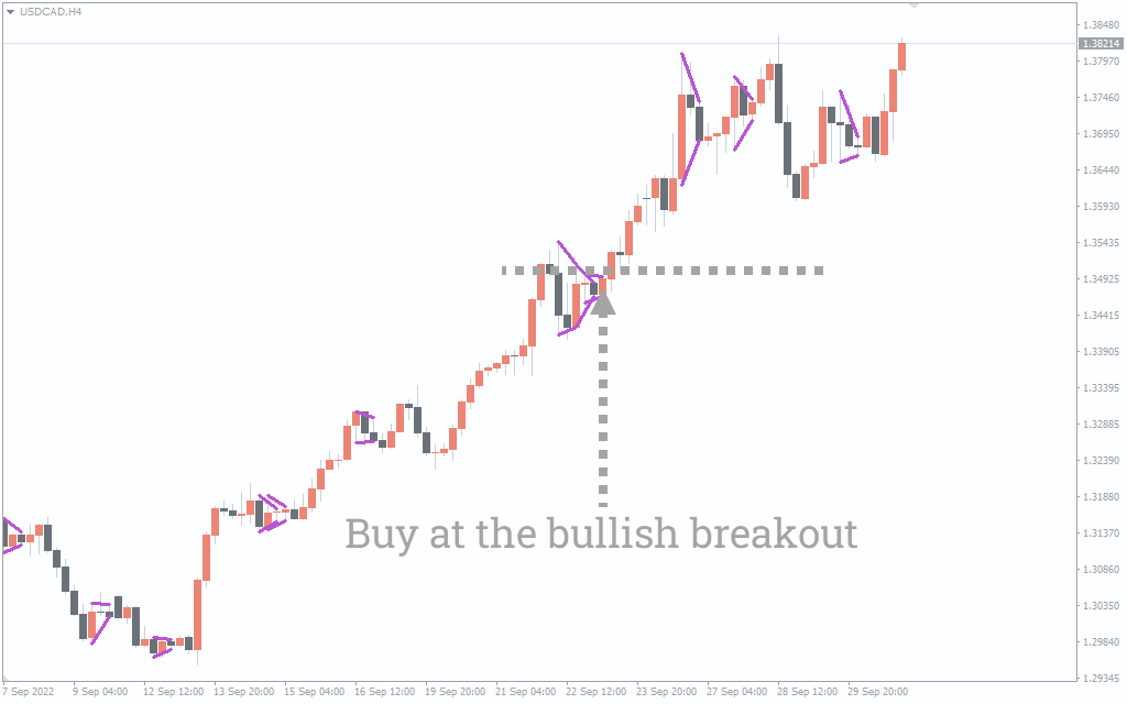 Once the price breaks the high or low of the descending market range, we’ll consider it a potential breakout. However, the breakout direction can be both within or against the recent market trend. Novice traders should only pick the signals plotted within the current market trend, whereas experienced traders may also look for counter-trend opportunities.