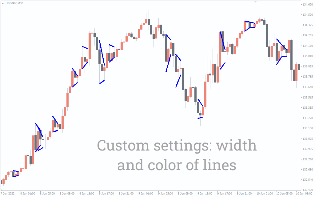 Whenever the price forms a large bullish or bearish bar, the indicator considers the candle as the main bar. The movement of the second bar should be limited to the range of the main candle. The third bar must move opposite the main bar, forming a price swing pattern.