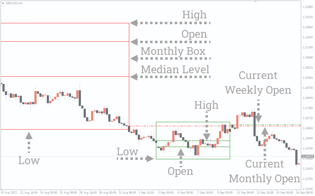 The high and low of the box helps you anticipate the targets and stop-loss limits for your trade entries. For instance, you’ve placed a buy order based on a bullish breakout at the daily, weekly, or monthly median. In such conditions, you may place SL below the respective box’s low and target an exit near the box’s high.