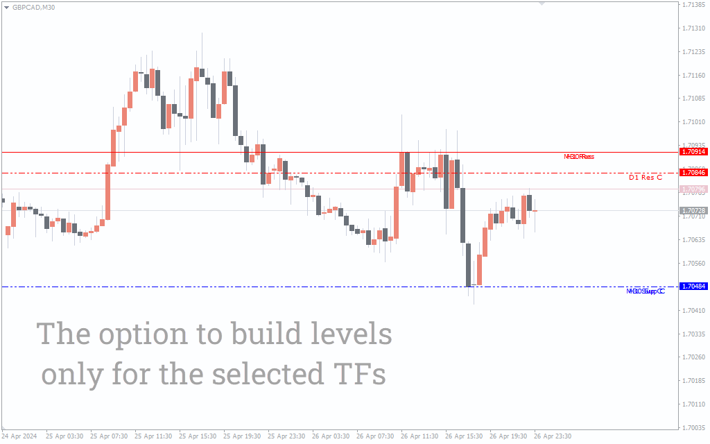 The indicator is suited for new and experienced traders as it is easy to read and understand. Moreover, the settings are simple, allowing you to turn on or off specific timeframe support and resistance levels.