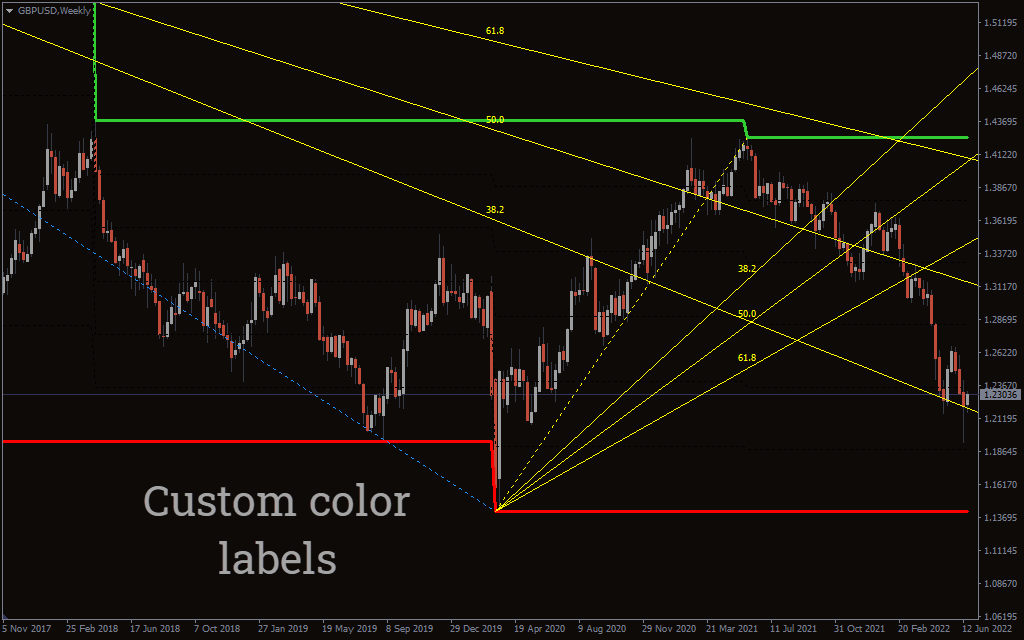 The indicator automatically plots a trading channel. It does this by identifying the fractal levels and Fibonacci retracement points on your MT4 chart. Moreover, it also plots the levels (Fractal and Fibonacci) in sync with the major trend of the market to ensure you don’t trade against the trend.