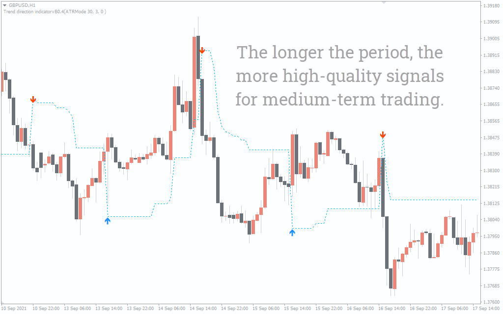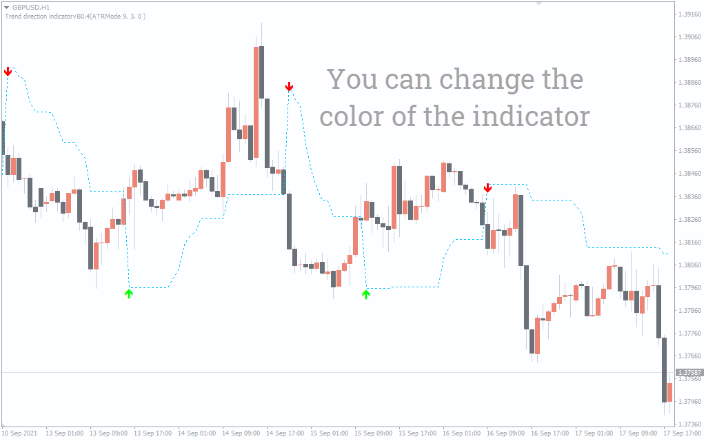The trend direction indicator follows the footsteps of the ATR (Average True Range) indicator and draws the lines in the direction of the trend.