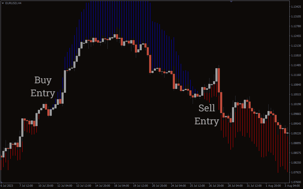 Thus, the indicator would paint a first blue bar at the top of a candlestick to signal the beginning of a potential long-term bullish move. On the other hand, it paints a first red bar at the bottom of a candlestick to indicate the beginning of a potential bearish move. Besides, it keeps displaying the blue/red bars as the trend progresses.