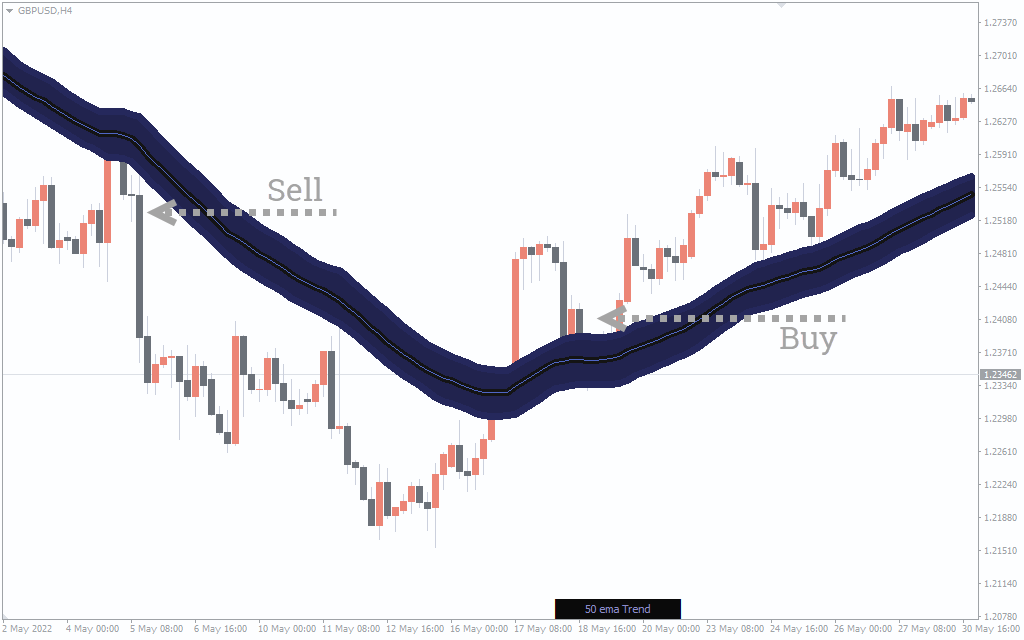 To find the trading signals, all you have to do is locate the EMA vs. SMA band. When the price dips below the band, you can enter short positions. Conversely, you can take long positions if the price goes above the band.