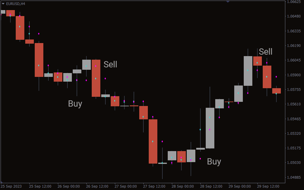 The trading strategy is to enter the markets based on whether the magenta dot is above or below the candlestick.