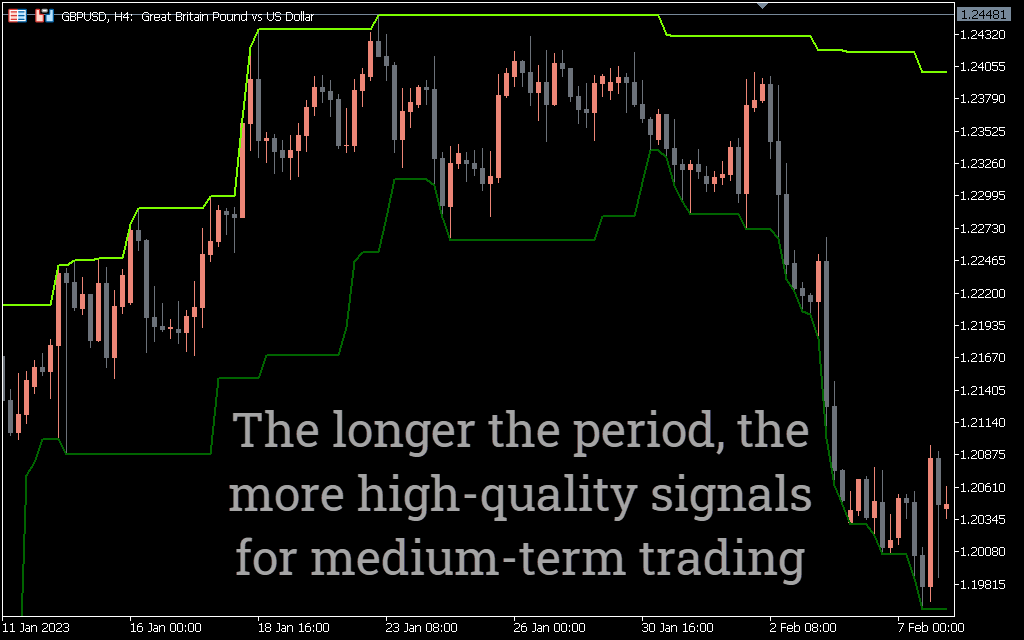 The image above shows the action of the indicator on the GBPUSD currency pair on the H4 timeframe. It illustrates how to identify a profitable high probability trade setup according to price action.