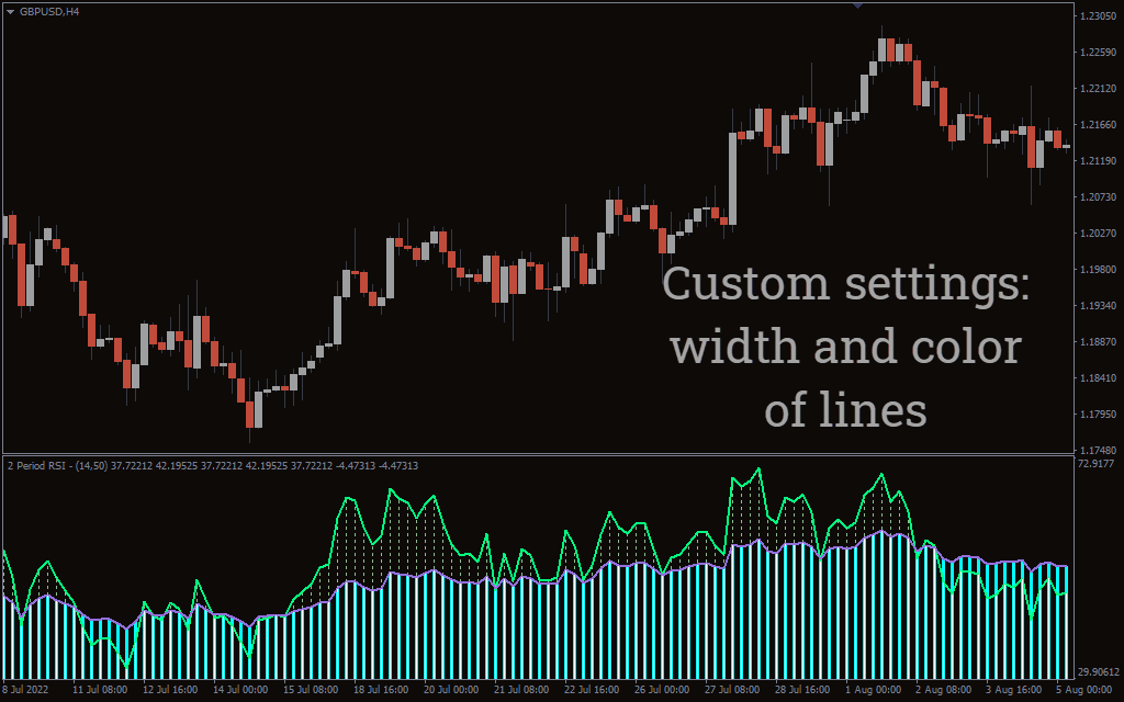 MT4A Two Period RSI indicator that uses short and long periods. It is an excellent tool for trend confirmation and a great trend reversal detector.